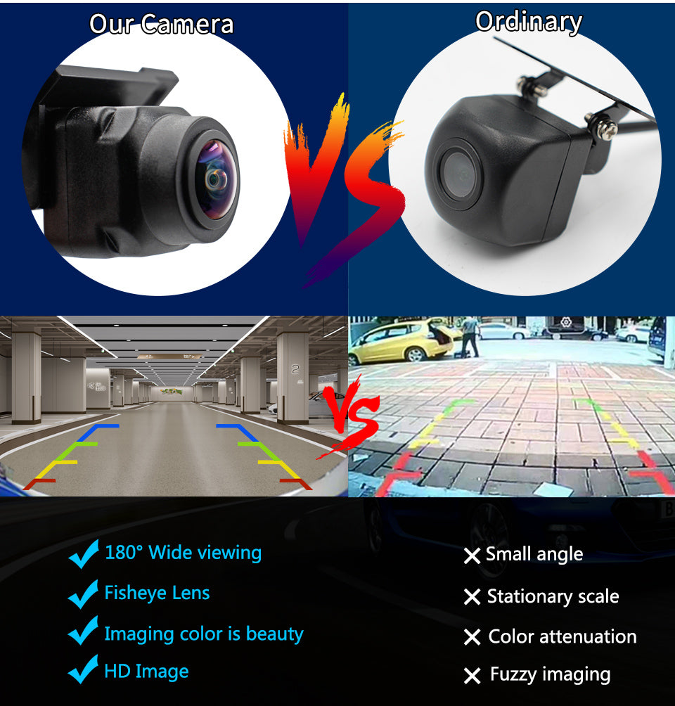 - Caméra de recul universelle de trajectoire : en appliquant une nouvelle technologie sur la puce, notre caméra de recul de plaque d'immatriculation affiche la ligne de guidage de trajectoire sans dispositif supplémentaire, sa ligne de guidage change automatiquement en fonction de la direction de déplacement de la voiture.