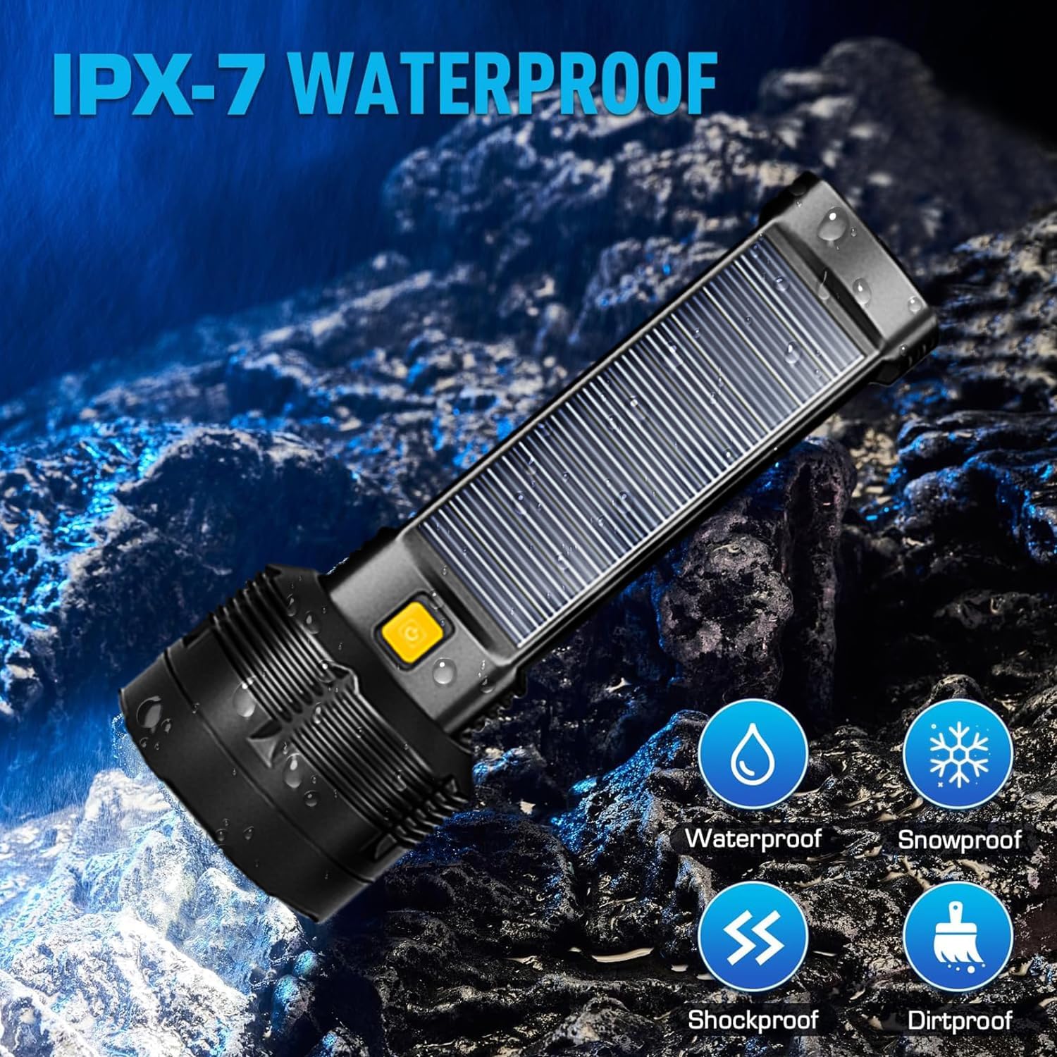 - Lampe torche rechargeable super lumineuse : notre lampe de poche solaire LED est divisée en lumière principale et veilleuse, avec 4 modes respectivement. La lumière principale peut irradier 800 mètres en mode haut. qui peuvent être utilisés comme lampes de travail en mode haut ou bas, les modes clignotants peuvent être utilisés comme éclairage d'urgence (fonction SOS). En tant que lampe de poche LED puissante, elle éclaire de grandes surfaces, assurant une visibilité claire même dans les environnements les plus sombres.