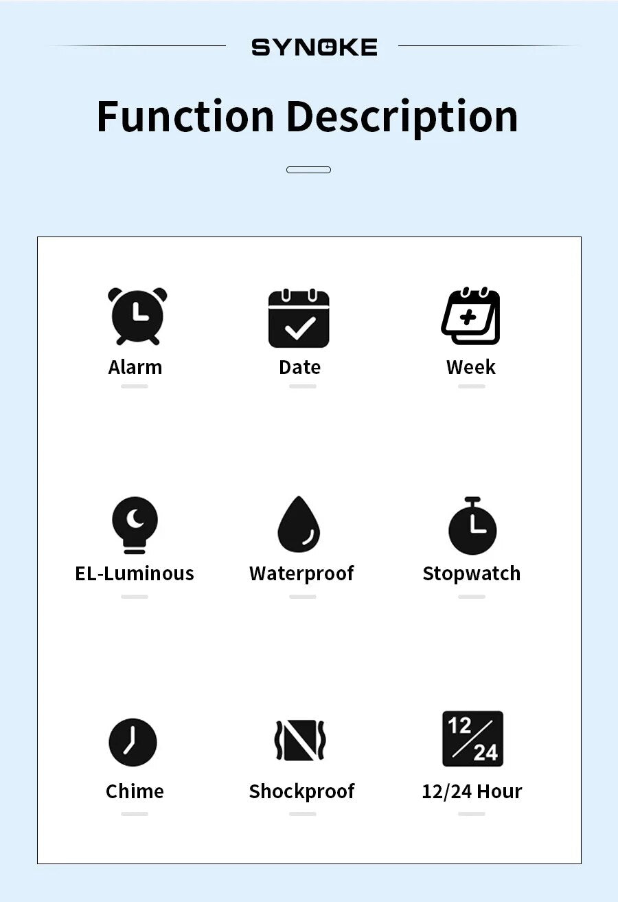 - Résistant à l'eau jusqu'à 5Bar : Cette montre numérique SYNOKE est résistante à l'eau jusqu'à 5Bar, ce qui la rend idéale pour les activités nautiques ou sportives. Elle peut résister à l'eau sans se détacher ni se freinér.